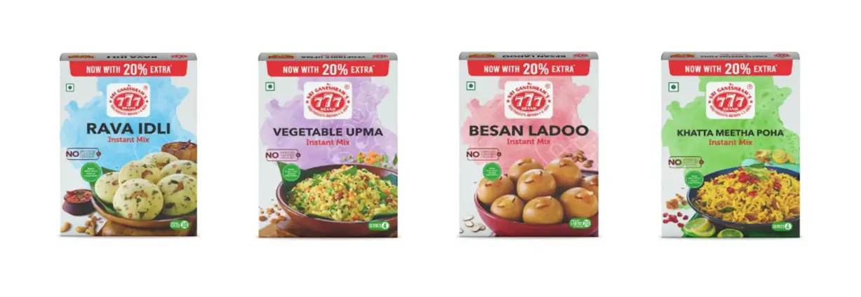 777’s packaging spans multiple categories (instant mixes, masala powders, vermicelli, oils, ready-to-eat chutneys, beverages) with inconsistent design approaches: