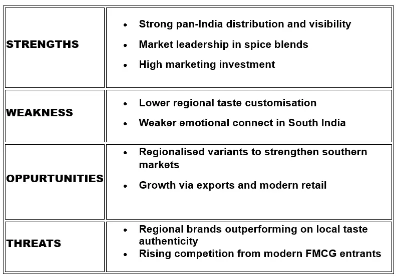 - Regional Strength: Strong in South India; less penetration at a national level compared with larger FMCG spice brands.
