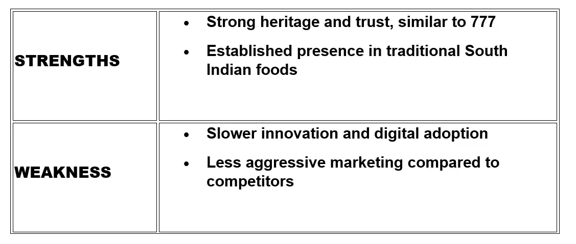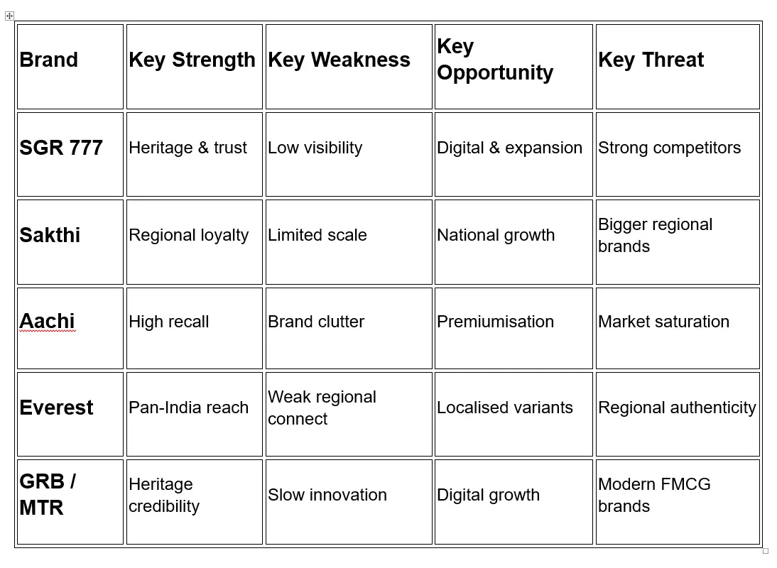 From a brand perspective, 777’s strongest asset is trust built through generations, rather than aggressive advertising or modern brand-building tactics. This has resulted in a stable but modest business scale, with revenues under ₹100 crore—reflecting strong regional performance but limited national expansion when compared to competitors such as Aachi, Sakthi, Everest, and MTR.