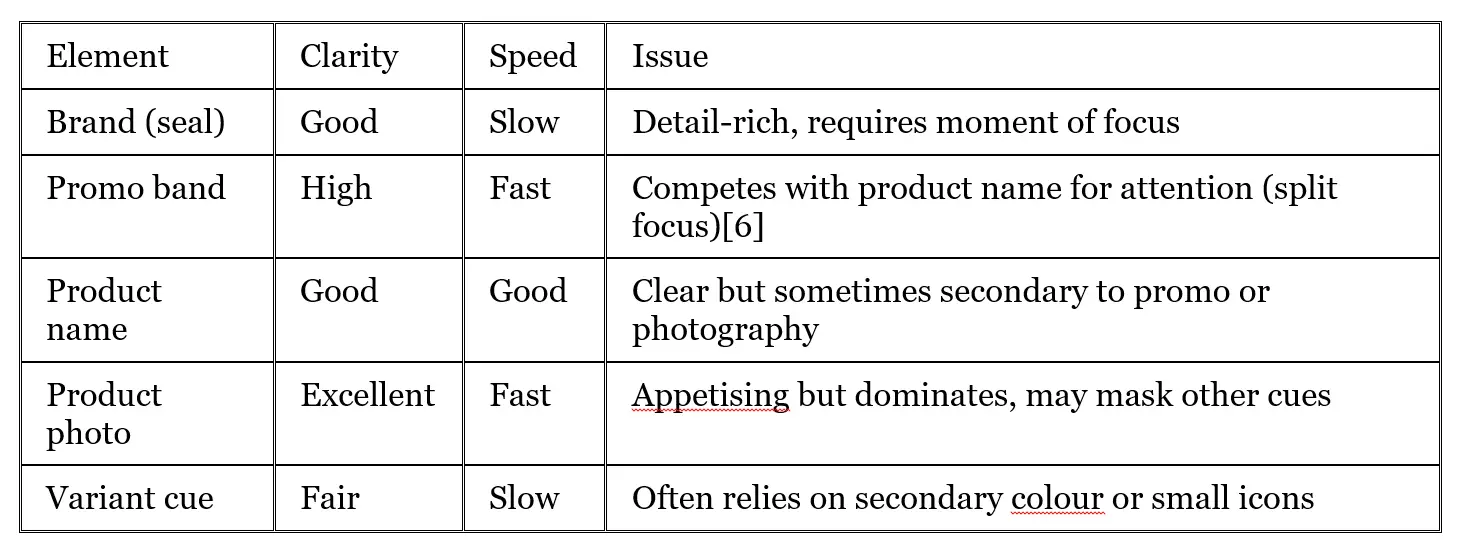 Research shows shoppers spend 1–3 seconds on a pack before moving on; successful packs guide the eye to: (1) brand recognition, (2) product type, (3) key benefit, (4) variant, in that order.[6][8]