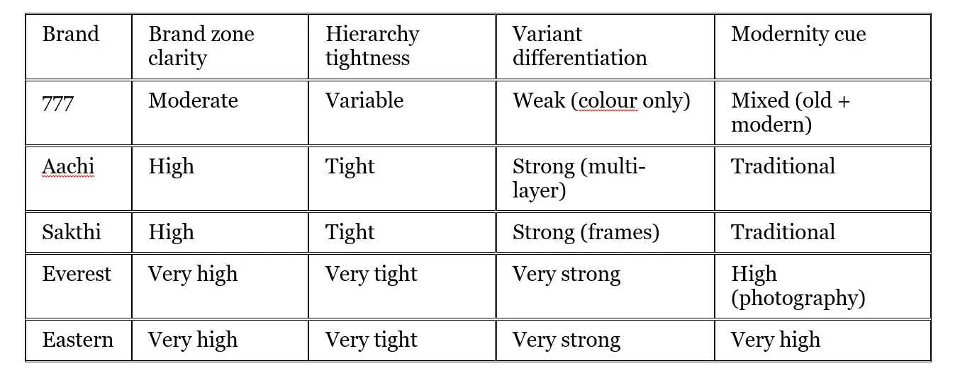 Gap: No single dominant “777 block” or masterbrand zone that shoppers instantly recognise across the shelf, unlike Everest’s red bar or Aachi’s red lozenge frame.