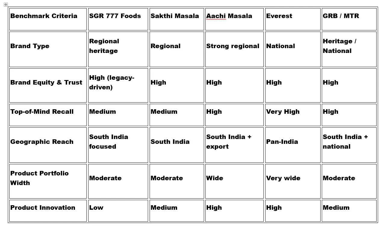 Competitors like Everest are built as pan-India spice leaders (large market share, standardised blends), while Aachi/Sakthi are strong regional challengers. 777’s unique place is heritage + restaurant lineage + South-centric portfolio, which is distinct from both mass national players and pure commodity regional players. - Credibility in specific traditional categories (pickles & podis)