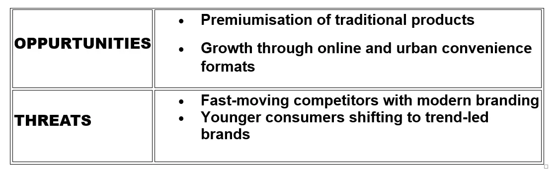 - Growth Context: Branded spices market is growing ~10–15% annually, offering opportunities for expansion if distribution and branding improve.